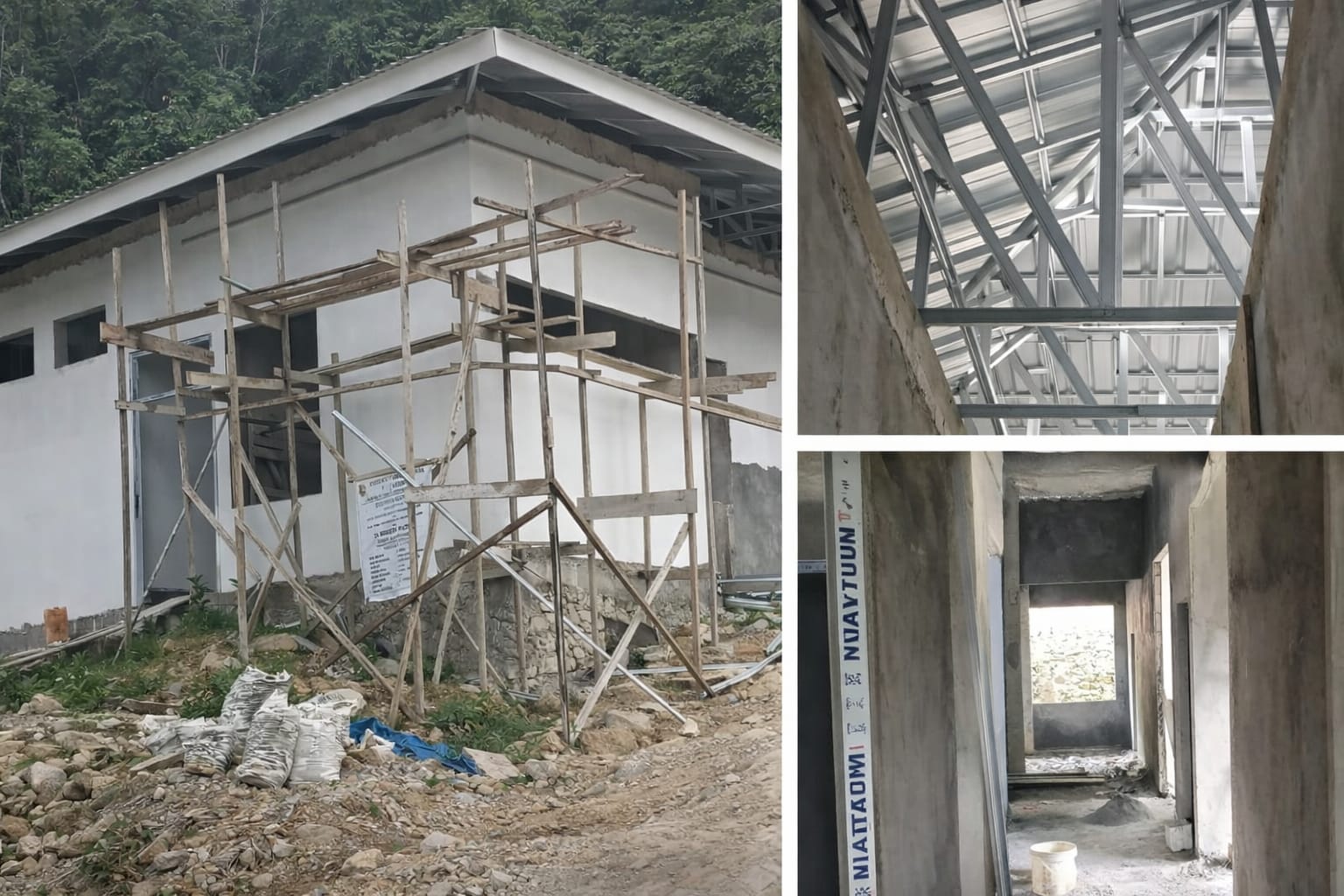 Tak hanya itu, pekerjaan pendukung seperti talang air, ornamen dinding, rabat beton, profil tangki air, serta pondasi area parkir juga belum tersentuh, padahal area tersebut berada di atas timbunan yang membutuhkan penanganan khusus.