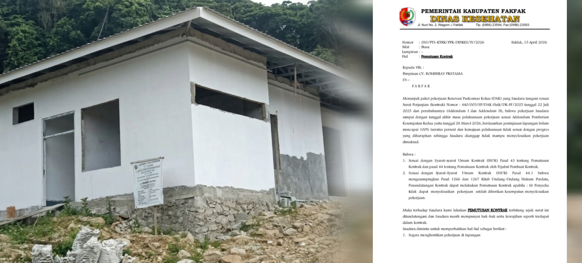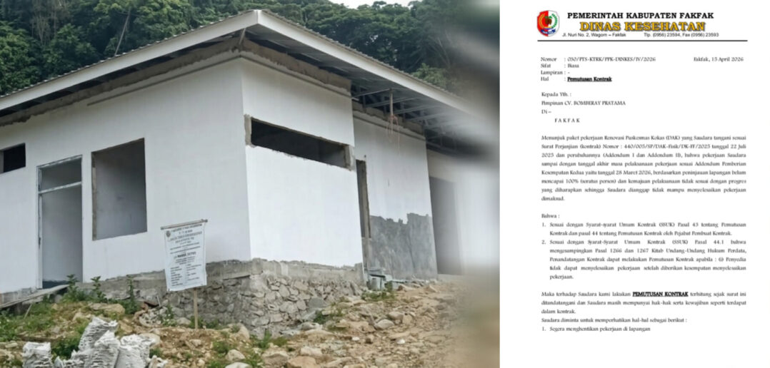 Pemutusan kontrak tertuang dalam surat bernomor 030/PTS-KTRK/PPK-DINKES/IV/2026 tertanggal 15 April 2026 yang ditandatangani Pejabat Pembuat Komitmen (PPK) Dinas Kesehatan Fakfak, Osbin.